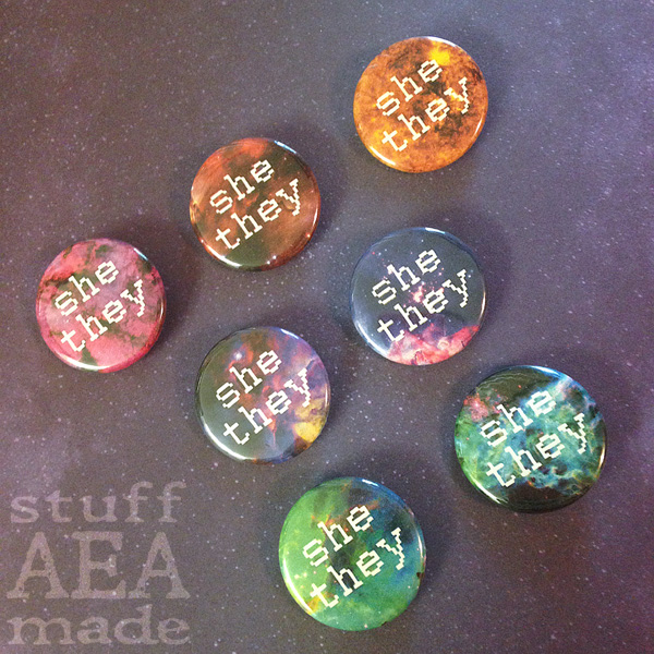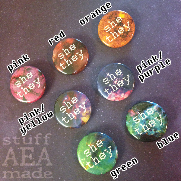 She / They These 1.25 inch // 3.175 cm pin back buttons are available in seven different galaxy colors!