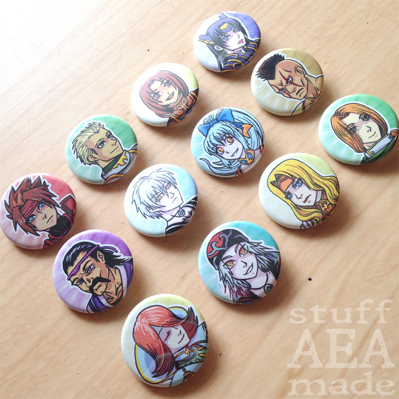 These 1.25 inch // 3.175 cm pin back buttons features the main party characters, as well as a few villains and NPCs